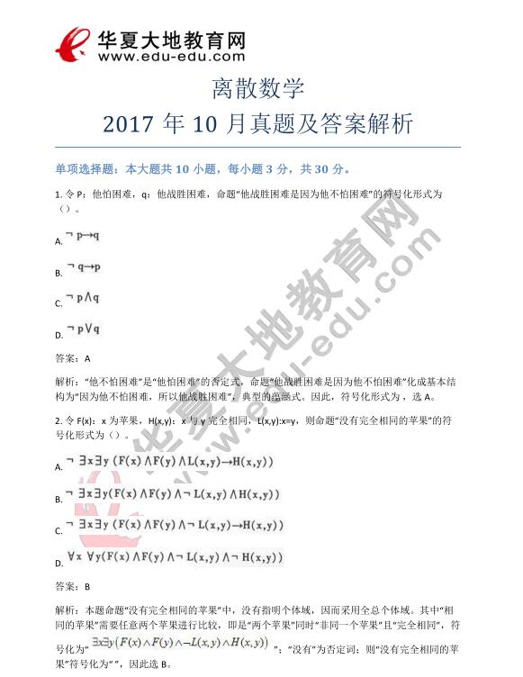 资料简介:离散数学2017年10月真题及答案解析