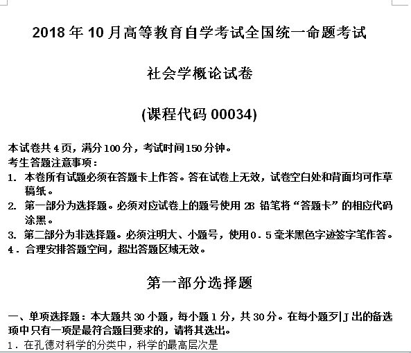 资料简介:2018年10月自考00034社会学概论试卷及答案
