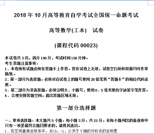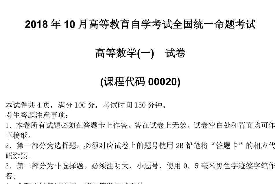 资料简介:2018年10月高等教育自学考试全国统一命题考试 高等数学(一) 试卷