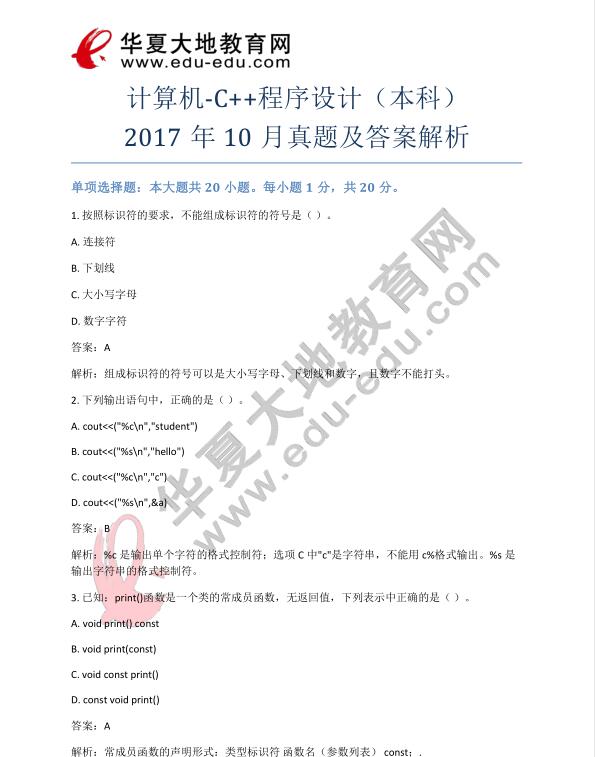 资料简介:自考《计算机-C++程序设计》(本科)2017年10月真题及答案解析
