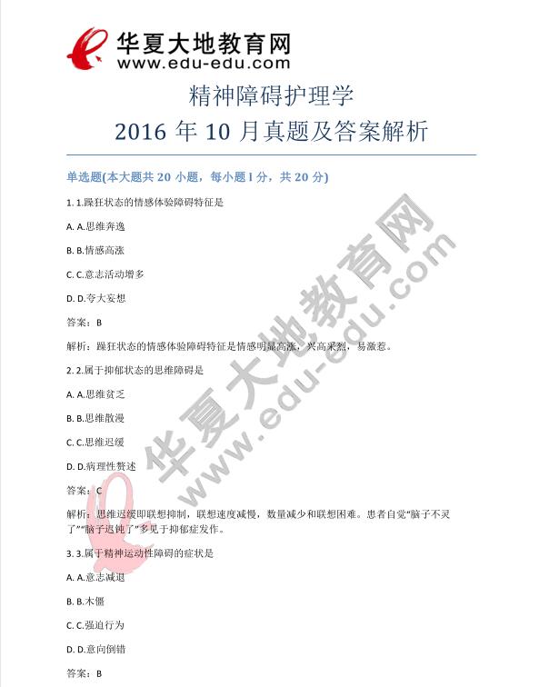 资料简介:精神障碍护理学2016年10月真题及答案解析