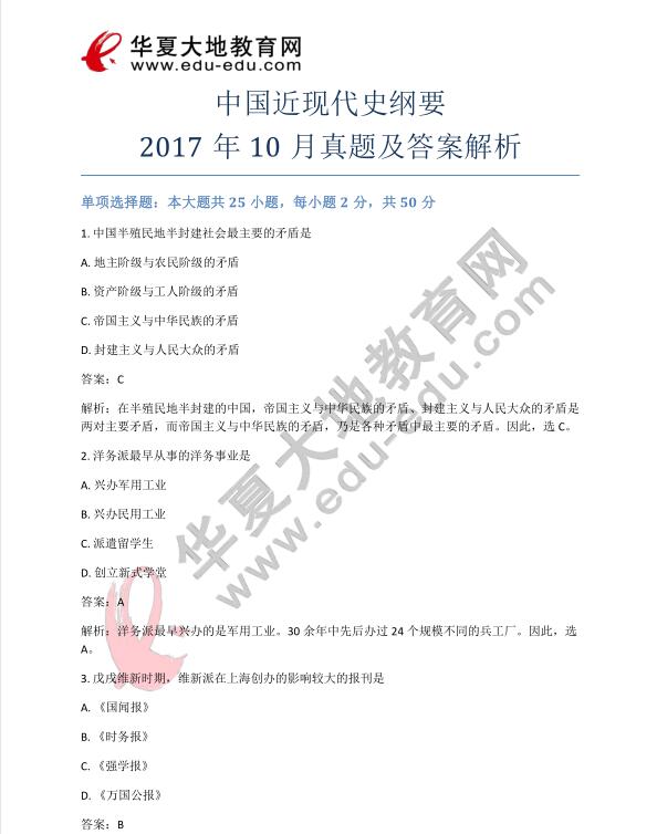 资料简介:中国近现代史纲要2017年10月真题及答案解析