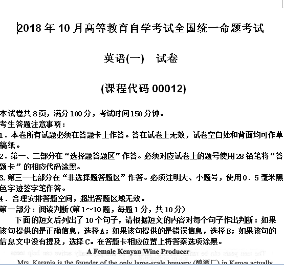 资料简介:2018年10月高等教育自学考试全国统一命题考试 英语(一) 试卷