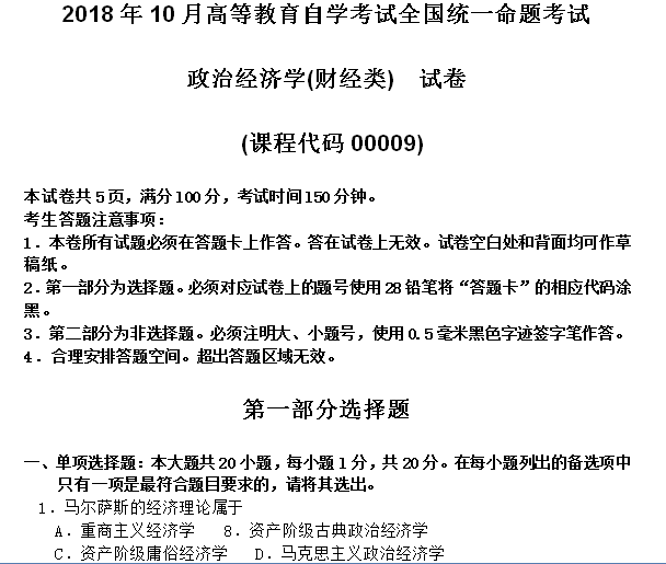 资料简介:2018年10月自考00009政治经济学(财经类)试卷及答案