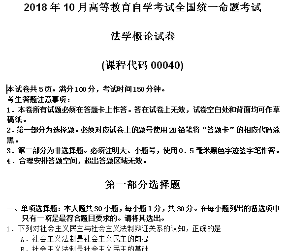 资料简介:2018年10月自考00040法学概论试卷及答案