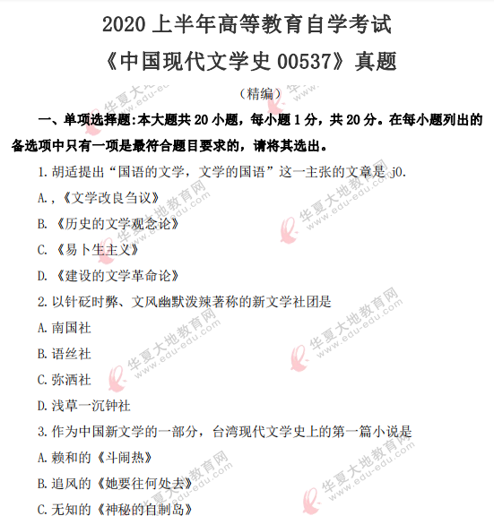 资料简介:2020年8月自考真题—《中国现代文学史00537》