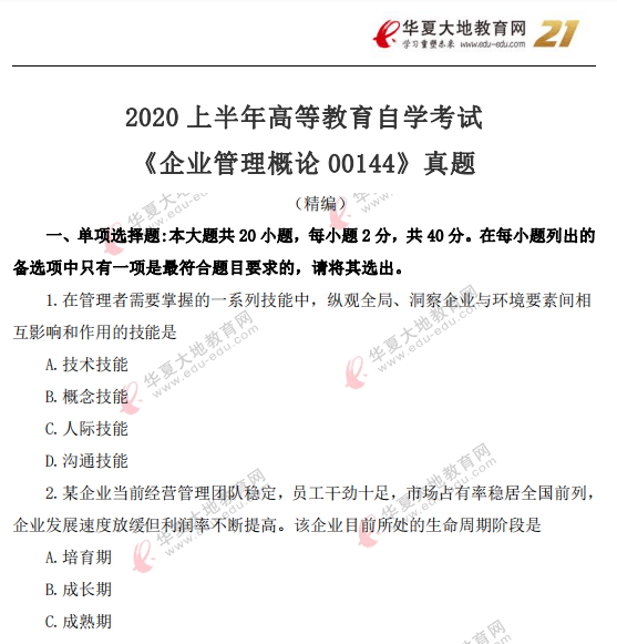 资料简介:2020年8月自考真题—《企业管理概论00144》
