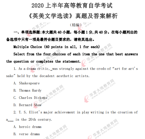 资料简介:2020年8月自考真题—《英美文学选读》