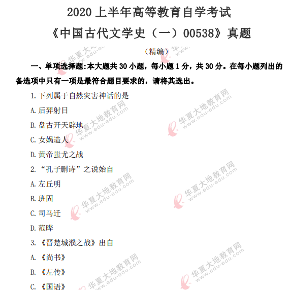 资料简介:2020年8月自考真题—《中国古代文学史(一)00538》