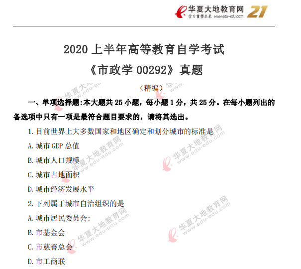 资料简介:2020年8月自考真题—《市政学00292》