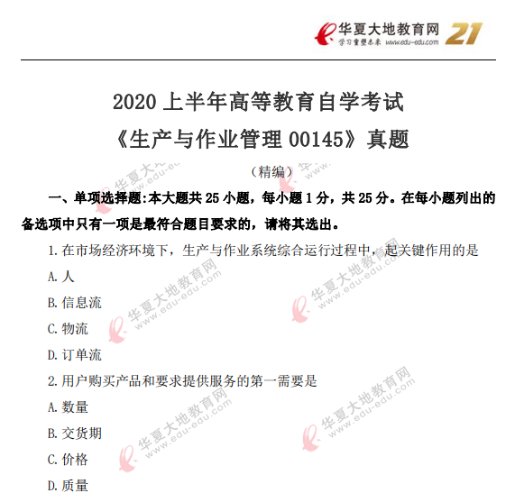 资料简介:2020年8月自考真题—《生产与作业管理00145》