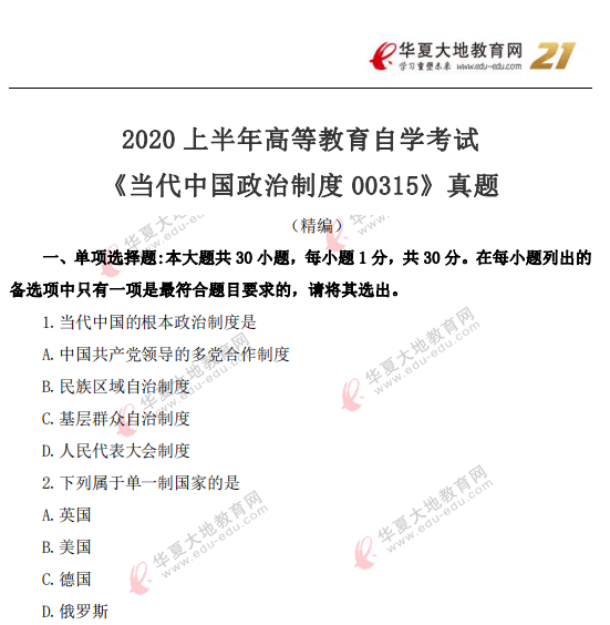 资料简介:2020年8月自考真题—《当代中国政治制度00315》