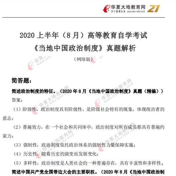 资料简介:2020年8月自考真题及答案—《当代中国政治制度》