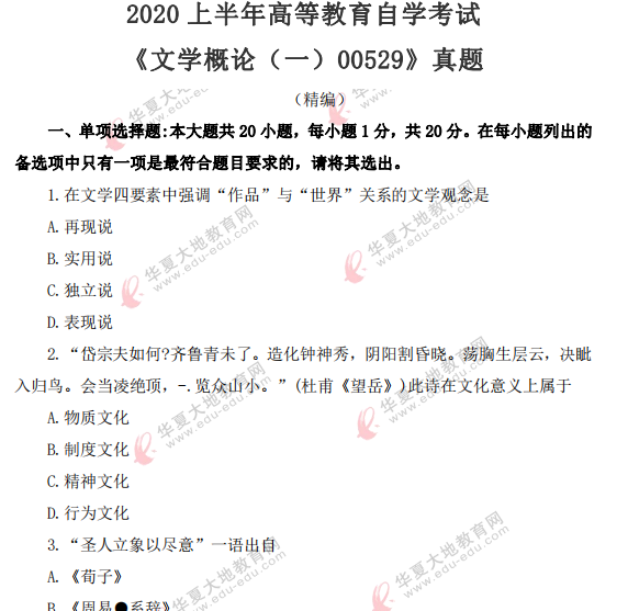 资料简介:2020年8月自考真题—《文学概论(一)00529》
