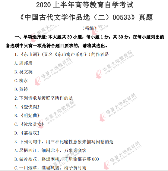 资料简介:2020年8月自考真题—《中国古代文学作品选(二)00533》