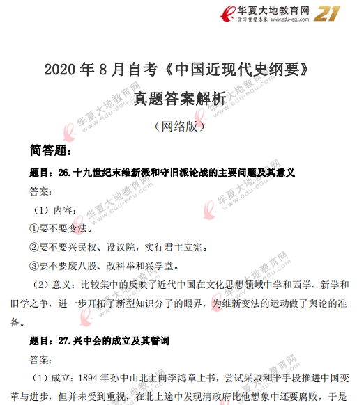 资料简介:2020年8月自考真题及答案—《中国近现代史纲要》